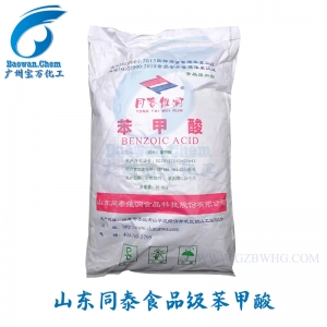 苯甲酸可以用作食品、饲料、乳胶、牙膏的防腐剂。在酸性条件下,对霉菌、酵母和细菌均有抑制作用,但对产酸菌作用较弱。苯甲酸分子态的抑菌活性较离子态高,故PH小于4时,抑菌活性高,抑菌的最适pH值为2.5~4.0,一般以低于pH值4.5~5.0为宜。由于苯甲酸对水的溶解度低,故实际多是加适量的碳酸钠或碳酸氢钠,用90℃以上热水溶解,使其转化成苯甲酸钠钠后才添加到食品中。若必须使用苯甲酸,可先用适量乙醇溶解后再应用。由于苯甲酸对水的溶解度比苯甲酸钠低,因此在酸性食品中使用苯甲酸钠时,要注意防止由于苯甲酸钠转变成苯甲酸而造成沉淀和降低其使用效果。苯甲酸在酱油、清凉饮料中可与对-羟基苯甲酸酯类一起使用而增效。