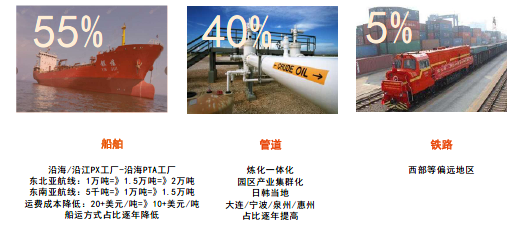 还有40%的PX货物采用管道运输,在炼化一体化、园区产业集群化的发展趋势下,管道运输占比出现明显提升,例如大连(福佳大化-逸盛石化)、泉州(福建联合-福建百宏)、宁波(宁波中金-逸盛新材料)、惠州(中海油惠州-恒力惠州)都存在直接运输PX的管道;另外5%的PX货物采用铁路运输,适用于西部等偏远地区。