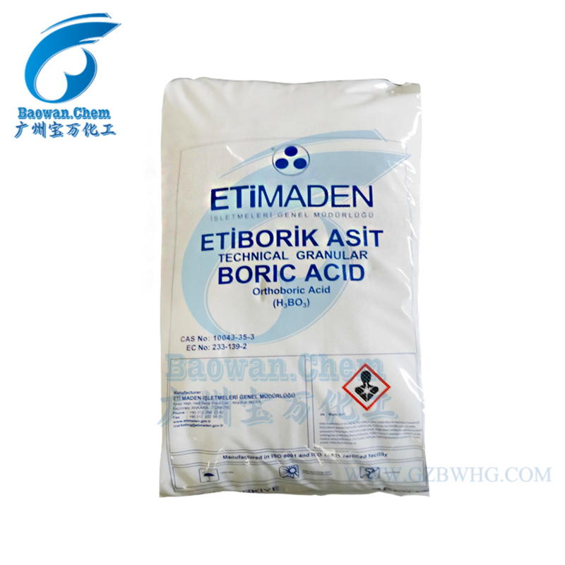 硼酸,为白色粉末状结晶或三斜轴面鳞片状光泽结晶,有滑腻手感,无臭味。溶于水、酒精、甘油、醚类及香精油中,水溶液呈弱酸性。大量用于玻璃(光学玻璃、耐酸玻璃、耐热玻璃、绝缘材料用玻璃纤维)工业,可以改善玻璃制品的耐热、透明性能,提高机械强度,缩短熔融时间。