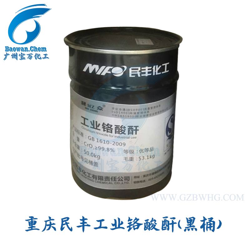 三氧化铬(chromium trioxide),为铬酸酐,分子式为CrO3,分子量为99.99。为暗红色或暗紫色斜方结晶,易潮解。加热至熔点开始分解,加热至沸点完全分解。用于生产铬的化合物,氧化剂,催化剂,此外还用于木材防腐,电镀等。由浓硫酸与重铬酸钾反应制得。中文名三氧化铬 英文名chromium trioxide 别 称铬酸酐
