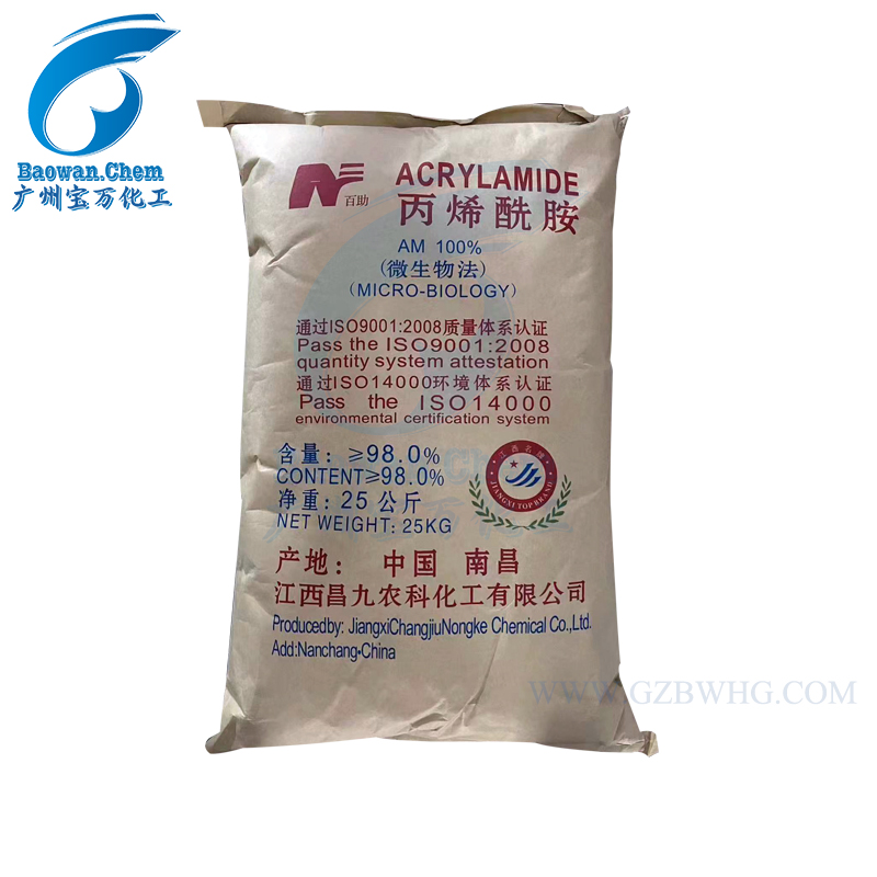 丙烯酰胺是一种不饱和酰胺,别名AM,其单体为无色透明片状结晶,沸点125℃(3325Pa),熔点84~85℃,密度1.122g/cm3。能溶于水、乙醇、乙醚、丙酮、氯仿,不溶于苯及庚烷中,在酸碱环境中可水解成丙烯酸。是有机合成材料的单体,生产医药、染料、涂料的中间体。丙烯酰胺单体在室温下很稳定,但当处于熔点或以上温度、氧化条件以及在紫外线的作用下很容易发生聚合反应。当加热使其溶解时,丙烯酰胺释放出强烈的腐蚀性气体和氮的氧化物类化合物。
