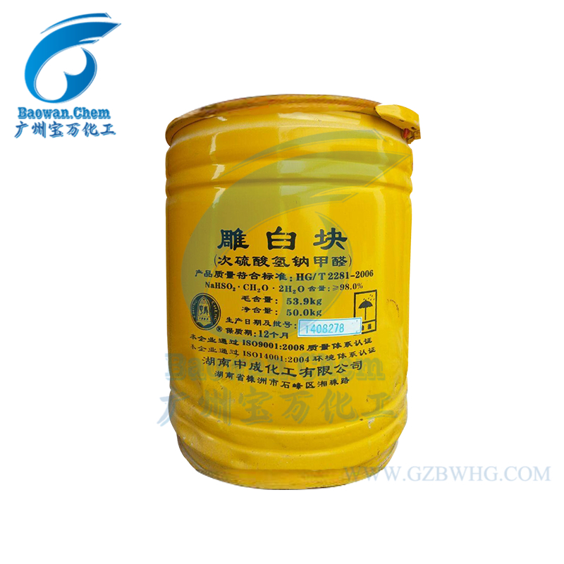 又称雕白粉,系以福尔马林结合亚硫酸氢钠再还原制得,化学名称为次硫酸氢钠甲醛或甲醛合次硫酸氢钠,分子式为NaHS02·CH20·2H20。呈白色块状或结晶性粉状,易溶于水。常温时较为稳定,高温下具有极强的还原性,有漂白作用。遇酸即分解,其水溶液在60℃以上就开始分解出有害物质,120℃下分解产生甲醛、二氧化硫和硫化氢等有毒气体 。